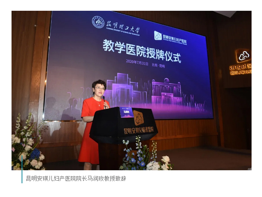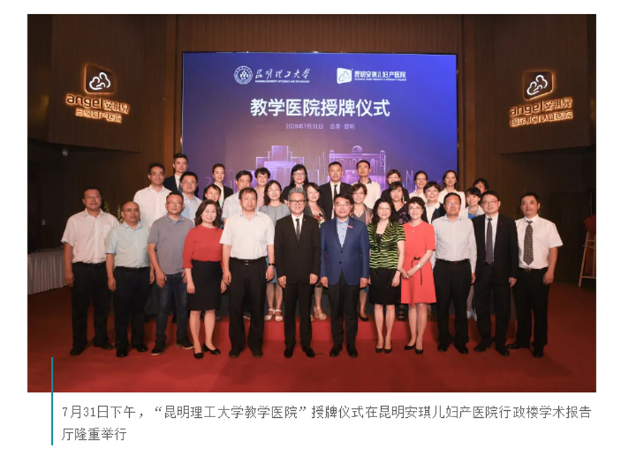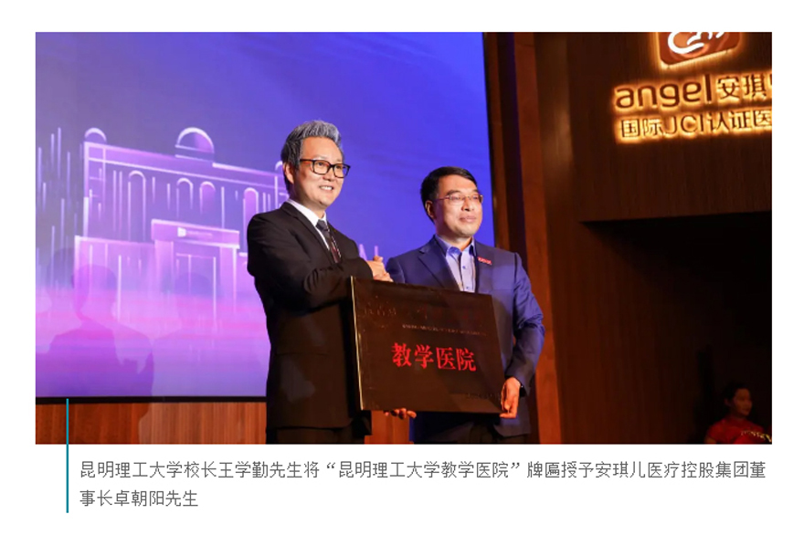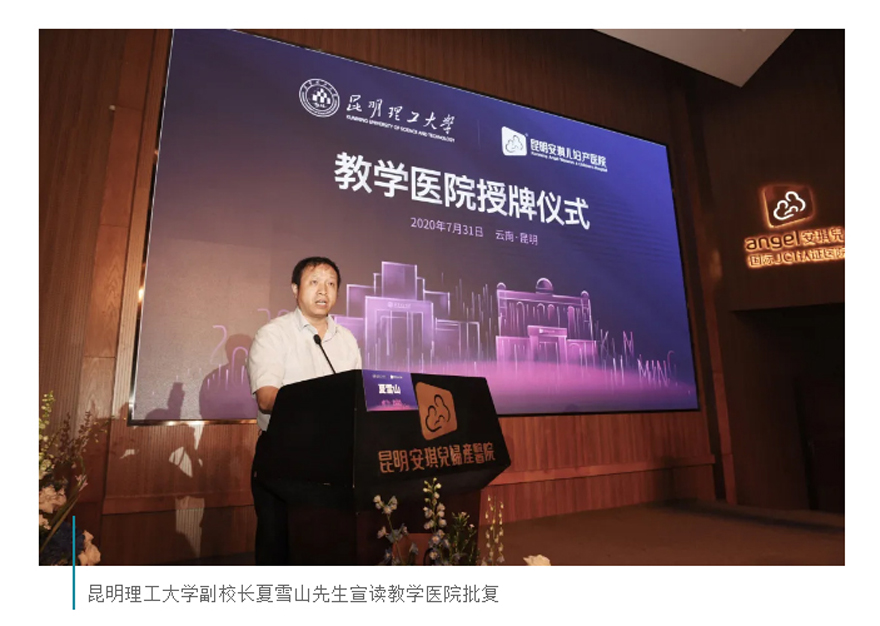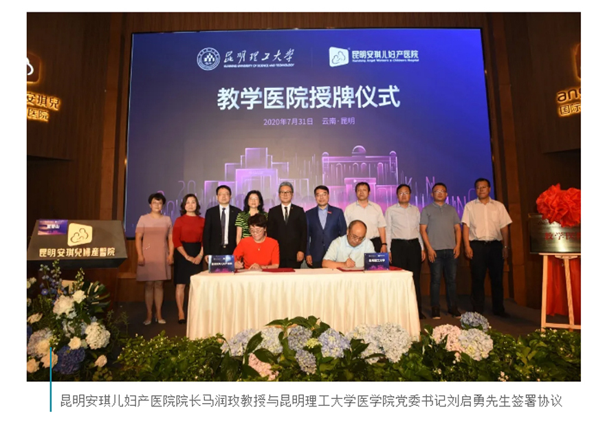 仪式上,昆明理工大学副校长夏雪山宣读《昆明理工大学关于昆明安琪儿妇产医院作为昆明理工大学教学医院的批复》。昆明安琪儿妇产医院院长马润玫与昆明理工大学医学院党委书记刘启勇签署《昆明理工大学教学医院教学工作协议书》。