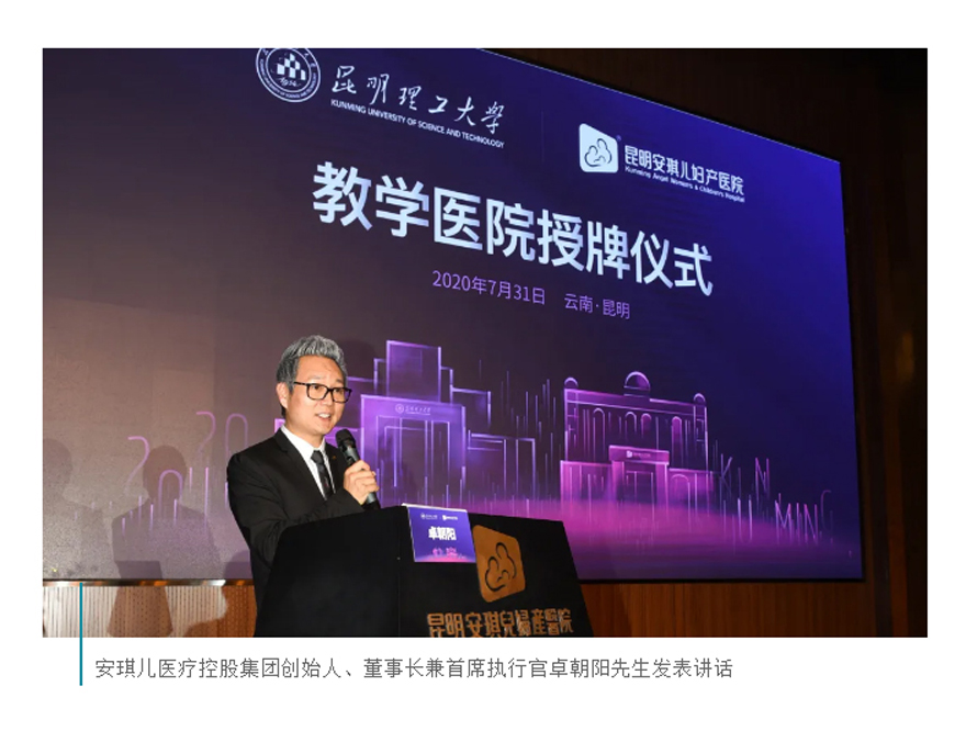 安琪儿医疗控股集团创始人、董事长兼首席执行官卓朝阳在讲话中谈到,医疗、教学、科研是医院发展的三大支柱,与高等医学院校建立长期稳定关系,创建教学医院是安琪儿医疗控股集团发展道路中的重要拼图。昆明理工大学是全国享有盛誉的优秀学府,成立多年的校医学院也拥有着一流的师资人才储备和科研技术实力。昆明安琪儿妇产医院成为昆明理工大学教学医院,是校院合作“优质医疗+优势教育”的强强联合,优势互补、资源互用,既能发挥学校和医院的各自优势,又能共同培养社会与市场需要的人才,是合作共赢且具有重要意义的事业。安琪儿将继续坚持先进的企业文化内涵,不忘办院初心,牢记医者使命,守正创新、砥砺前行,走医疗、教学、科研三位一体相结合的道路。