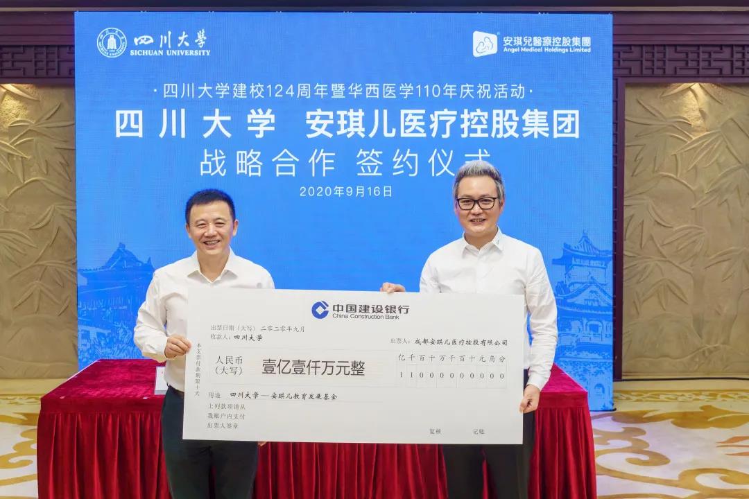 2020年9月16日,四川大学、安琪儿医疗控股集团正式达成战略合作,并于川大望江校区举行签约仪式,宣布设立1.1亿元“四川大学·安琪儿教育发展基金”。四川大学校长李言荣,副校长张林,华西临床医学院/华西医院党委书记张伟,党政办主任李正赤,华西医学中心常务副主任沈彬,外联办主任荣建国,华西第二医院党委书记王素霞,四川大学商学院EMBA教育中心常务副主任曹麒麟;安琪儿医疗控股集团创始人、董事长兼首席执行官卓朝阳,新加坡淡马锡代表陆佳敏,香港新程投资代表纪晨,集团联合创始人、董事、副总裁蒋林,集团联合创始人、董事、副总裁黄国强,集团董事会秘书、首席财务官张泓帆,集团首席品牌官蔡靖,集团首席行政官徐玥等领导出席此次仪式。