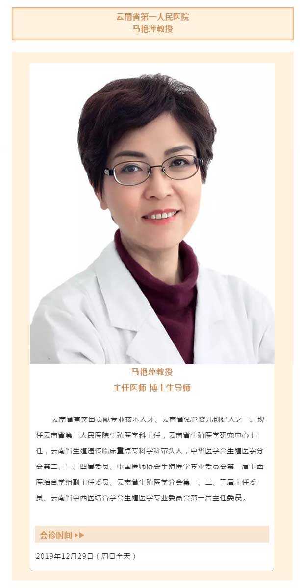 昆明安琪儿妇产医院生殖医学科将在2019年末12月29日邀请来自云南省第一人民医院马艳萍 教授、生殖医学专家教授级名医到院一对一会诊,专家护航,扫平您助孕路上的障碍。