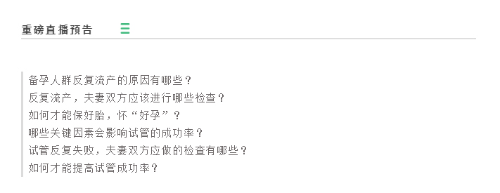 如果您也经历过一次次的反复移植失败、一次次的复发流产,如果您的生育希望越来越渺茫;如果 您想进一步了解试管知识,或正准备做试管,或者还在试管路上徘徊,那就千万不要错过这场直播, 争取做到不走弯路,一次成功。