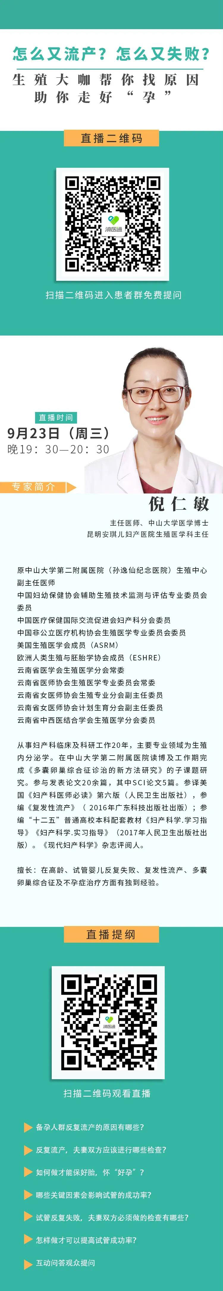 9月23日(周三)晚(19:30—20:30),倪仁敏主任将做客滇医通直播间,为大家解答试管反复 失败、反复流产的那些事,并免费为大家“一对一”答疑解惑。快快扫描二维码入群提问吧!