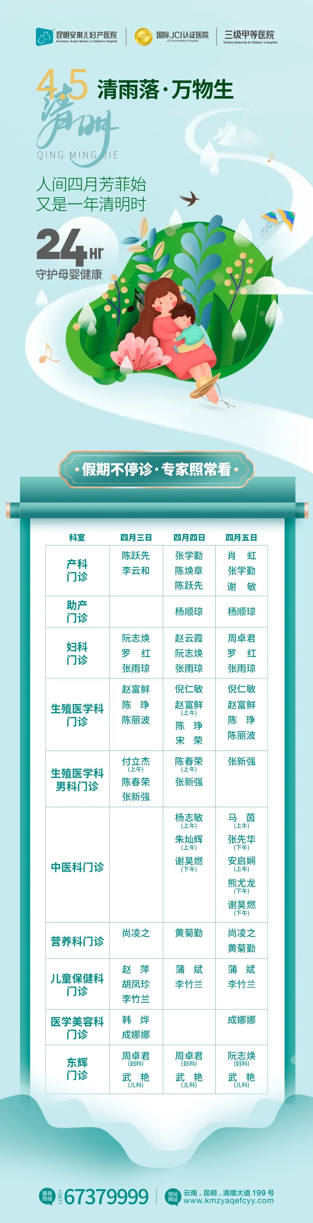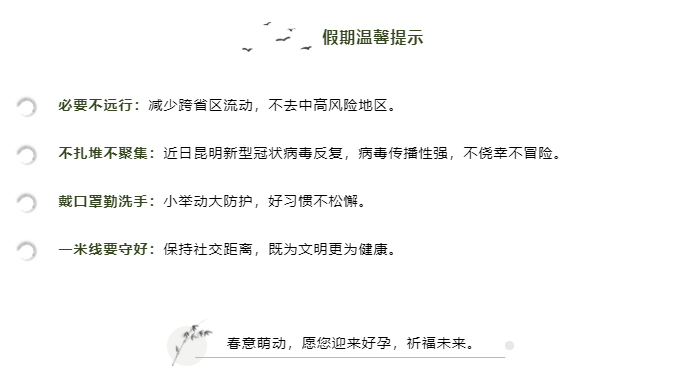清明节假日期间,为了方便广大朋友就诊,昆明安琪儿妇产医院清明节不放假,4月3日至4月5日我院 照常接诊。建议广大患者及家属在做好个人防护的情况下,合理安排好就医时间,有序就诊。