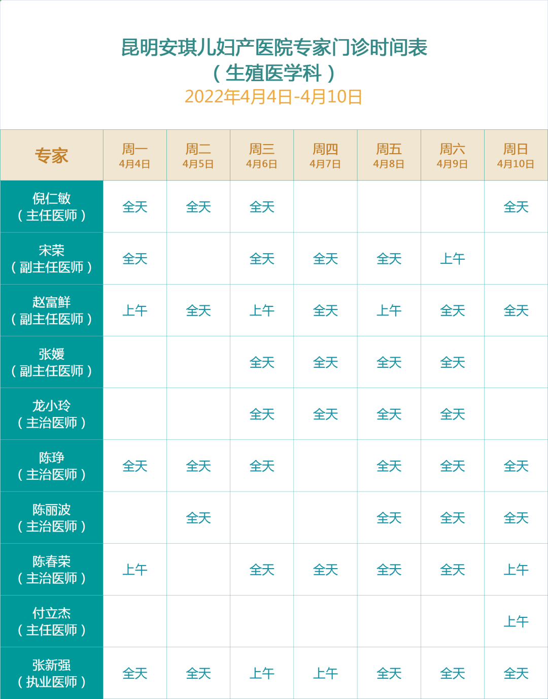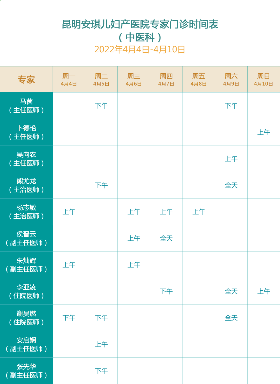 在此,我们为您附上《2022年清明专家门诊时间表》,您可根据需要选择到院日期,如有临时调整, 请以当日预约挂号信息为准。