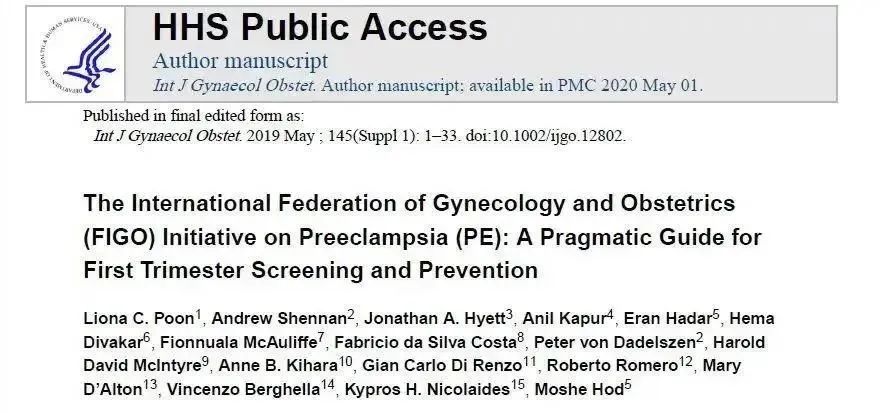 根据国际妇产科联盟(FIGO)2019年3月发布了关于早孕期子痫前期筛查和预防的指南(FIGO Good clinical