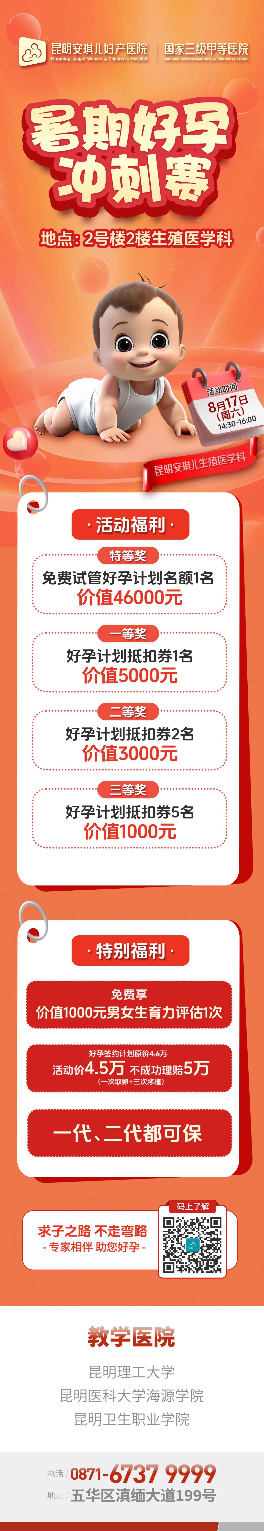 为解决广大不孕不育家庭的困扰,持续提升患者就医获得感和幸福感,2024年8月17日(周六)14:30, 昆明安琪儿妇产医院生殖医学科将开展『暑期好孕冲刺赛』暑期专场活动。