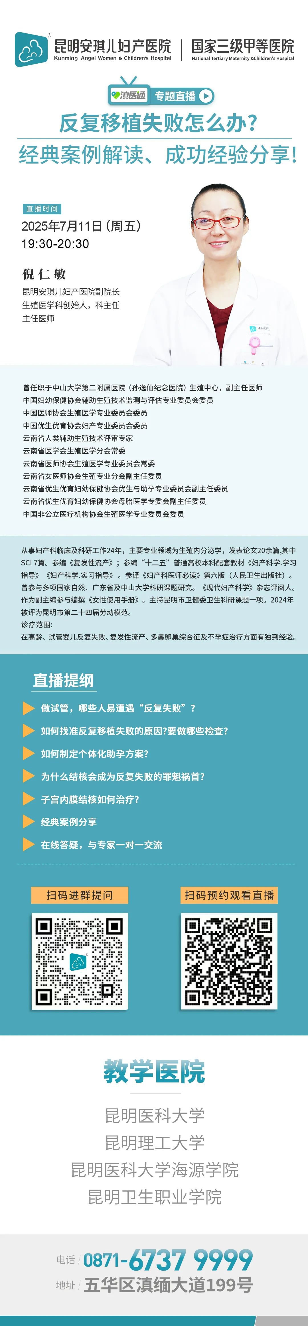 如果你正深陷“反复失败”的困境,请关注7月11日19:30昆明安琪儿妇产医院生殖医学科倪仁敏主任的直播,欢迎你