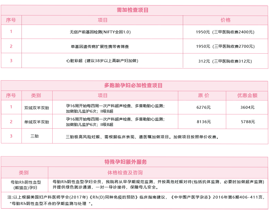 | 3 | 产前检查20-24周 | 产前检查:体重、血压、心率、体温、血氧饱和度医生问诊、孕期咨询、孕期保健知识、优生营养指导 | 系统超声、多普勒胎心监测 | ¥832.0 | |